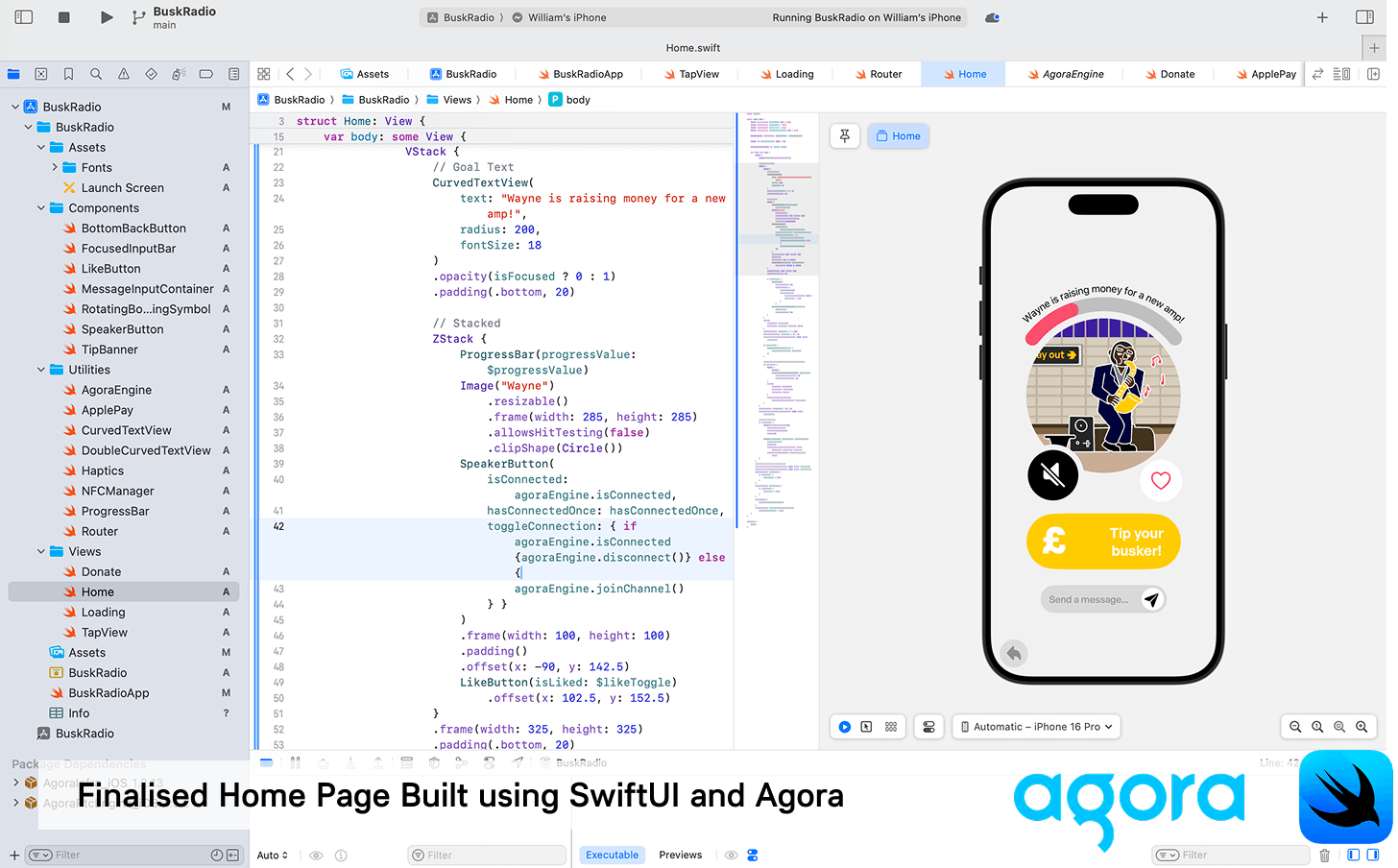 I transformed our Figma prototypes into a SwiftUI app, building custom components for audio streaming, gestures, and haptic feedback. The app integrated Agora for live streaming, Apple Pay for donations, and NFC for tap-to-connect interactions. In parallel, I developed the Tap Point hardware with a Raspberry Pi Zero 2 W and Codec Zero, enabling WiFi connectivity and real-time streaming.